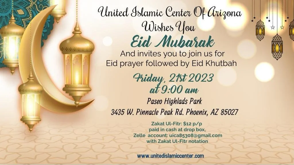 UICA - Eid Fitr Prayer 2023 Friday, April 21, 2023 9:00 AM 10:00 AM 09:00 10:00 Google Calendar ICS View fullsize Friday, April 21, 2023 Eid Prayer at 9 AMDirection: Paseo Highland Park 12125 E Vía Linda, Scottsdale, AZ 85259