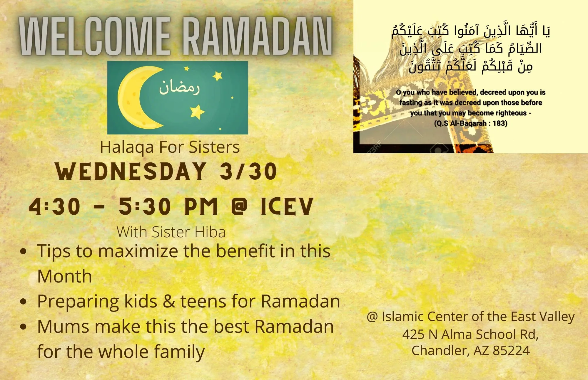 Welcome Ramadan Wednesday, March 30, 2022 4:30 PM 5:30 PM 16:30 17:30 Google Calendar ICS View fullsize Wednesday, March 30, 2022 from 4:30 PM till 5:30 PMDirection: 425 N Alma School Rd, Chandler, AZ 85224