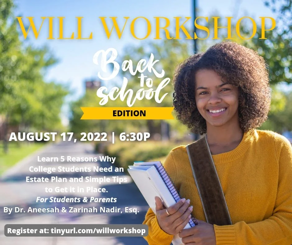 Did you know that college students need to get a Will just as much as their grandparents do? August is Make-A-Will month, and with the school year kicking off mother and daughter duo, the Nadirs, are presenting "Will Workshop, Back to School Edition"!