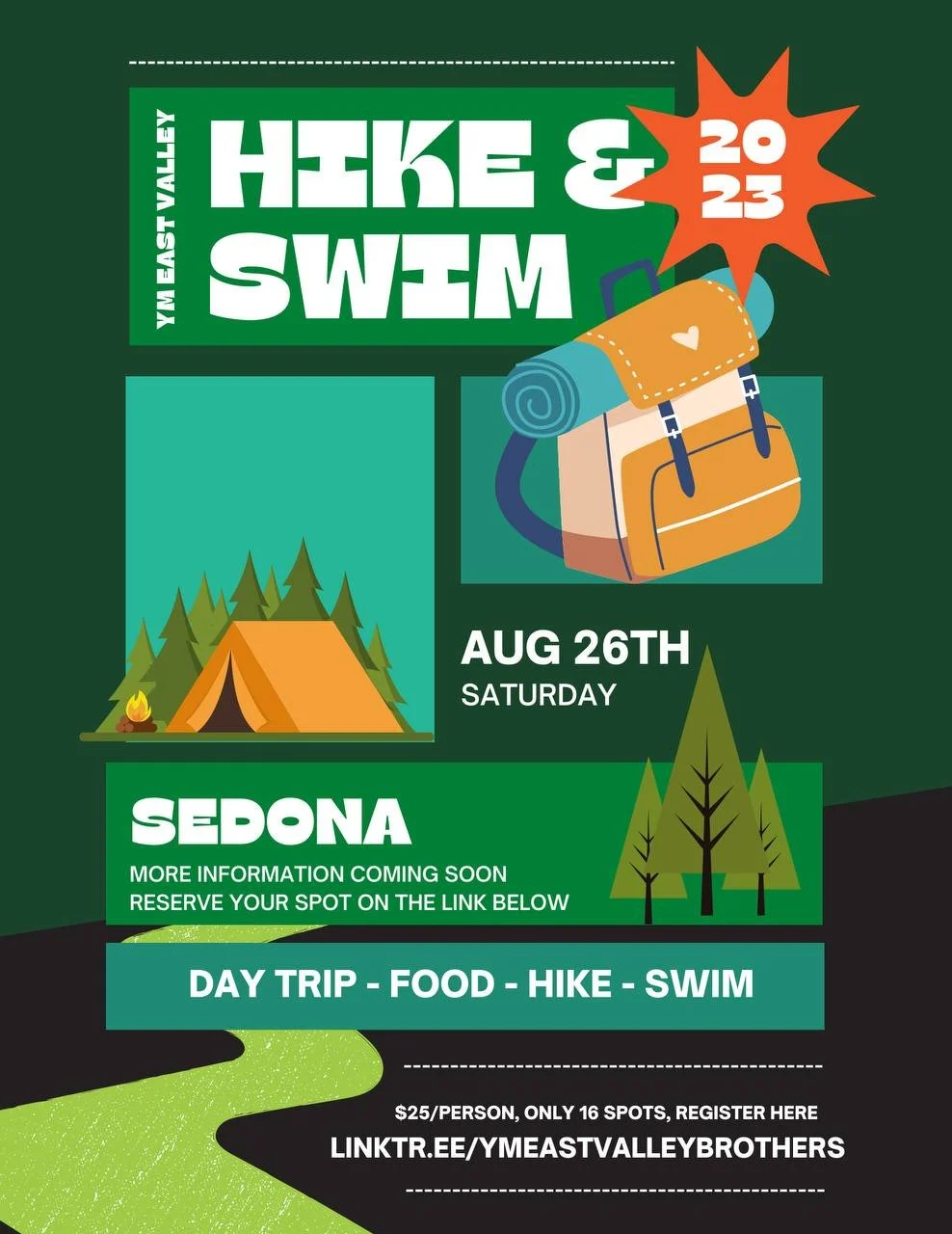 YM East Valley - Hike & Swim 2023 Saturday, August 26, 2023 7:00 AM 8:00 PM 07:00 20:00 Google Calendar ICS View fullsize Saturday, August 26, 2023 Direction: SedonaRegistration: For brothers ages 15-25: https://linktr.ee/ymeastvalleybrothers