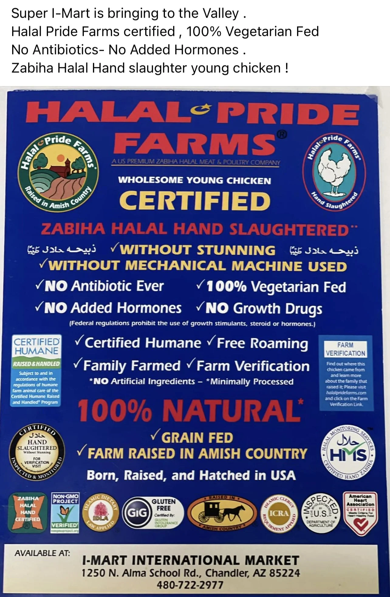 Halal Pride Farms at I-Mart View fullsize I-Mart International MarketDirection: 1250 N Alma School Rd, Chandler, AZ 85224 Asma NooruddinJanuary 5, 2023Comment Facebook0 Twitter LinkedIn0 Reddit Tumblr 0 Likes