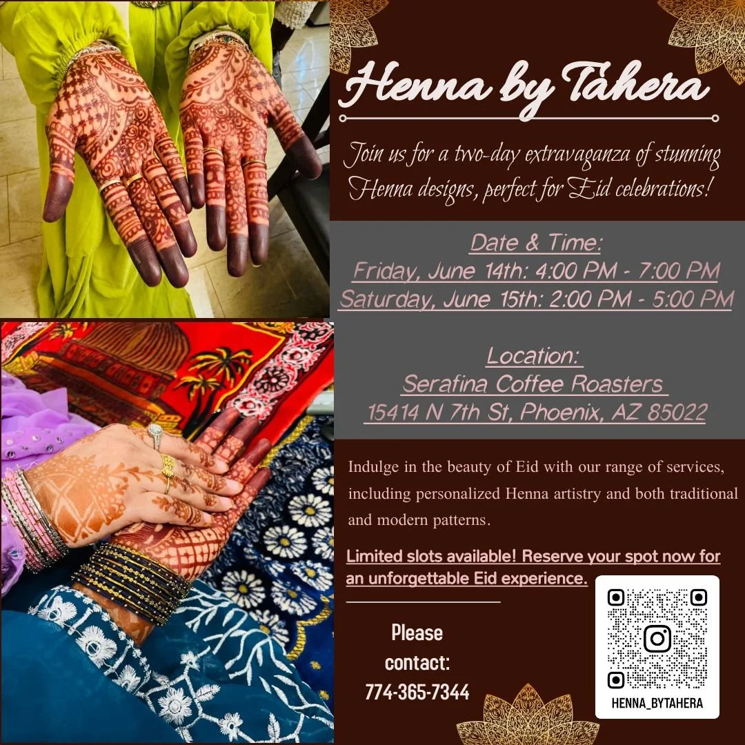 🎉 Join us on Friday, June 14th, from 4:00 PM to 7:00 PM, and Saturday, June 15th, from 2:00 PM to 5:00 PM, at Serafina coffee roasters, for two days of amazing Eid Henna!